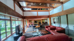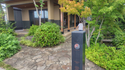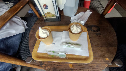 日本庭園を挟んでカフェと休憩スペース(この休憩スペースが2階建てで立派すぎる建物)、他の喫茶店でモーニングしたばかりなのでソフトクリームで一休み!