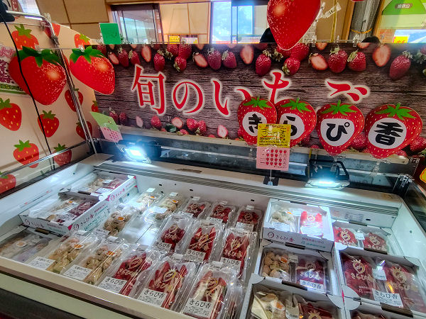 当日はキッチンカーやテントで小物なども売られており多くの人で賑わっていました、 販売所は土地の野菜はもちろん鶏ちゃん(や鶏ちゃんのタレ)に大きく美味しそうないちごなどたくさん!